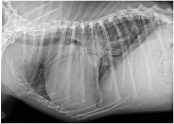 Röntgenbild vom Dobermann mit vergrößertem Herz und Wasser in der Lunge