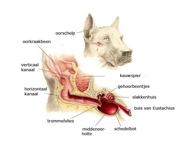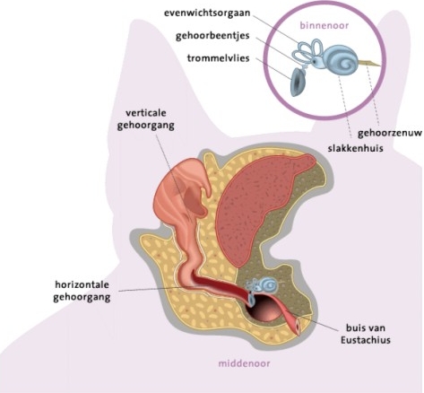 Das gesamte Ohr besteht aus einem Außen-, Mittel- und Innenohr. Das Außenohr umfasst die Ohrmuschel (Pina) und den vertikalen und horizontalen Gehörgang. Das Mittelohr besteht aus den drei Gehörknöchelchen, dem Hammer, Amboss und Steigbügel. Das Innenohr besteht aus der Cochlea (Schnecke) und dem Gleichgewichtsorgan (Labyrinth). Das Trommelfell (Membrana Tympani) befindet sich zwischen Außen- und Mittelohr und das Vestibulum zwischen Mittel- und Innenohr. Vom Innenohr aus verläuft der Hör- und Gleichgewichtsnerv weiter zum Gehirn.